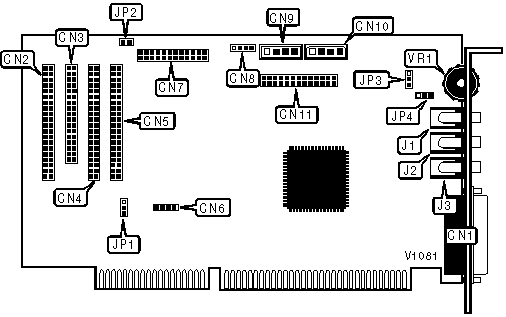 CD-ROM audio in (3), CD-ROM interface (3), game/MIDI port, IDE (AT) interface, line in, microphone in, speaker/line out, synthesis connector (2), volume, wavetable connector |