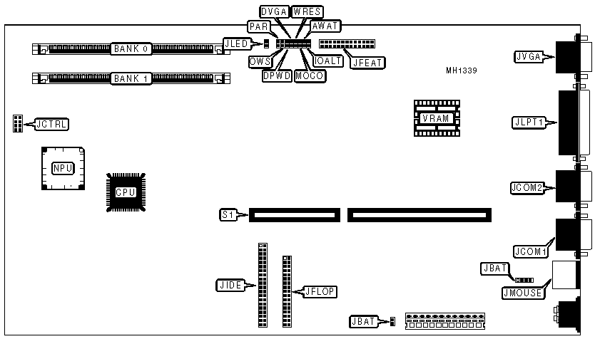 16-bit riser card slot, floppy drive interface, IDE interface, parallel port, bus mouse port, serial port (2), VGA feature connector, VGA port |
