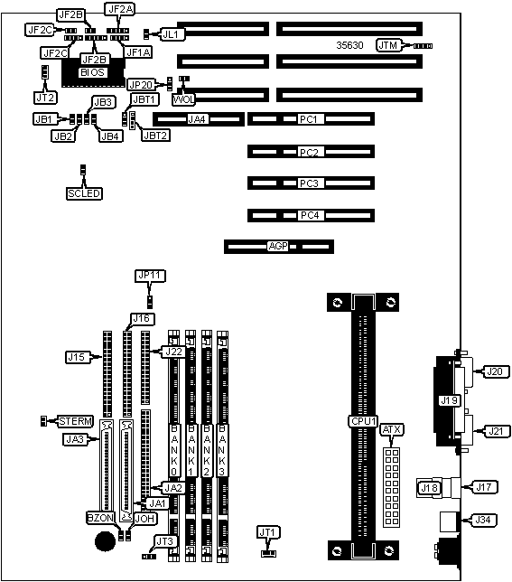 32-bit PCI slots (4), floppy drive interface, IDE interfaces (2), Wide Ultra SCSI interface, Wide SCSI interface (2), parallel port, PS/2 mouse port, serial ports (2), IR connector, USB connectors (2), ATX power connector, AGP slot, SB link connector |